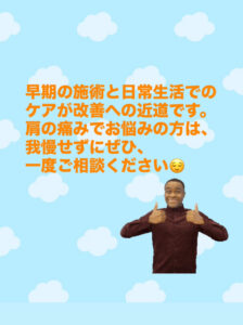 40肩? 50肩?😱 2025.10.13 ブログ 多くの方が通る道…40肩? 50肩? 我慢せずに是非お越し下さい😊 #整骨院 #高根木戸駅前整骨院 #高根木戸駅 #高根公団 #高根 #調整・矯正 #四十肩 #肩関節周囲炎 過去の投稿 ≫
