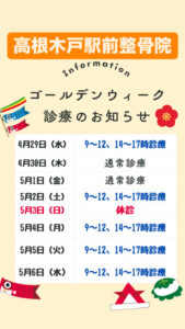 ゴールデンウィーク診療のお知らせ🙋♀️ 2026.04.29 お知らせ 5月3日日曜日以外は診療しています! ゴールデンウィーク中に しっかりお体を整えましょう☺️ #高根木戸整骨院 #高根木戸 #高根公団 高根木戸駅前整骨院Instagramもどうぞ🙆♀️ 過去の投稿 ≫